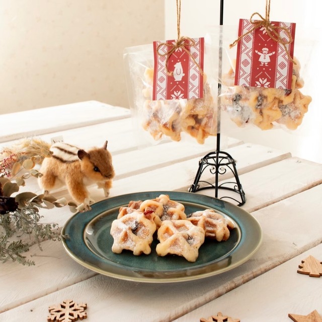 まるで雪の結晶のような、冬限定のひとくちわっふる。 ドライフルーツをたっぷり混ぜ込んで、粉砂糖で仕上げたパネトーネ風ワッフルです。 吊り下げ型の可愛らしいパッケージは、クリスマスツリーのオーナメントにも! -------------------- [セット内容] ◎パネトーネ風ワッフル[5個入]×1袋 -------------------- ■原材料名 ・パネトーネ風ワッフル:小麦粉(国内製造)、牛乳、マーガリン、卵、砂糖、ミックスドライフルーツ、粉糖、ドライイースト、食塩/乳化剤、トレハロース、香料、(一部に大豆・小麦・卵・乳成分を含む) ■アレルギー表示対象品目 小麦、卵、乳、落花生(ピーナッツ) ■賞味期限 製造日より14日 ■保存方法 直射日光をさけ、常温で保存してください。 ■原材料名 ・パネトーネ風ワッフル:小麦粉(国内製造)、牛乳、マーガリン、卵、砂糖、ミックスドライフルーツ、粉糖、ドライイースト、食塩/乳化剤、トレハロース、香料、(一部に大豆・小麦・卵・乳成分を含む) ■アレルギー表示対象品目 小麦、卵、乳、落花生(ピーナッツ) ■賞味期限 製造日より14日 ■保存方法 直射日光をさけ、常温で保存してください。