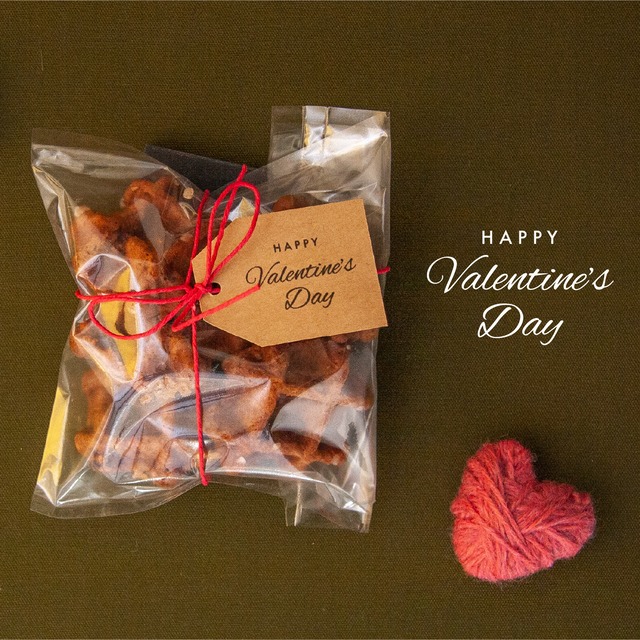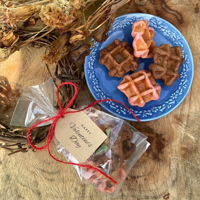 ザラメ糖入りのオリジナルクッキー生地をワッフルベーカーで焼き上げた、ザクザク食感のハードクッキーです。 ※ひとつづつ手作業で焼いており、大きさに多少の違いがあります。ご了承ください。 チョコチップ入りのクッキーに、バレンタインデザインのタグを付けた特別仕様です。