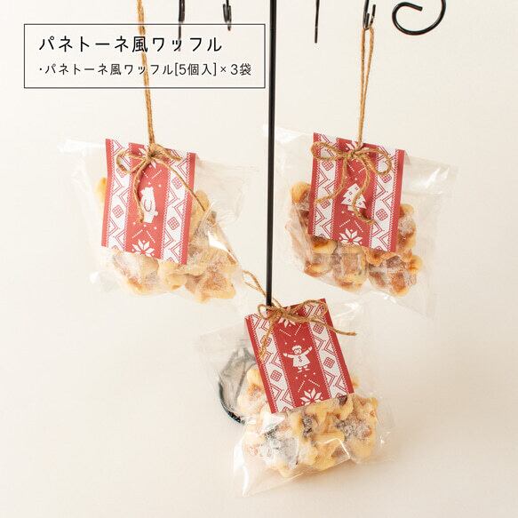 ・パネトーネ風ワッフル:小麦粉(国内製造)、牛乳、マーガリン、卵、砂糖、ミックスドライフルーツ、粉糖、ドライイースト、食塩/乳化剤、トレハロース、香料、(一部に大豆・小麦・卵・乳成分を含む)