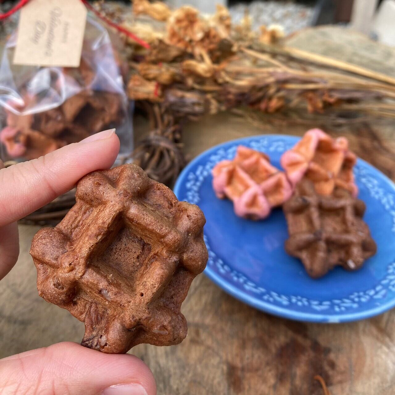 今年のワッフル屋どんぐりのバレンタインは、いちご味のピンクとココア味のブラウンのひとくちわっふる。